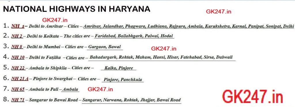 - हरियाणा मे कुल – 34 राष्ट्रीय राजमार्ग (National Highway) हैं, जिनकी कुल लम्बाई 2484 किलोमीटर है।